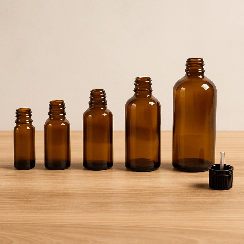 בקבוק זכוכית איכותי בצבע חום כהה, בנפח 10 , 20, 30, 50 ו100 מ"ל עם פיה בגודל 18 וטפי פנימי לנוחות שימוש מירבית.