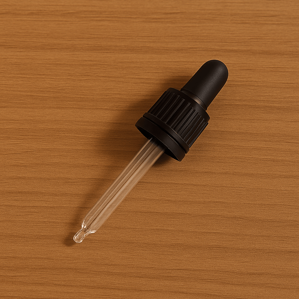 פיפטה זכוכית שקופה איכותית, מתאימה לבקבוקי זכוכית בעם פיה בקוטר 18, להזלפה מדויקת של שמנים אתרים, סרומים ותמציות נוזליות.