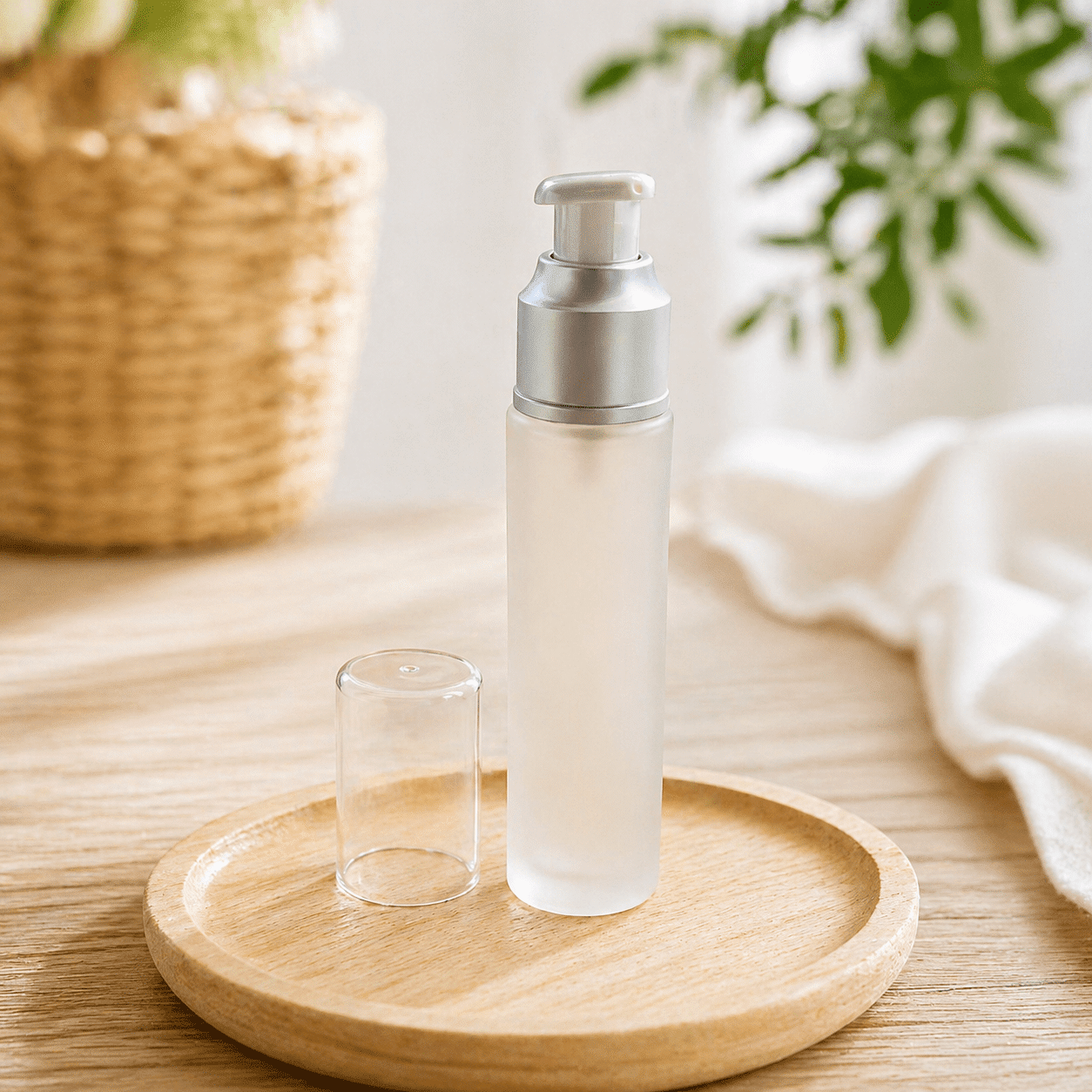 בקבוק זכוכית פרוסטד (Frosted Glass) בנפח 50 מ״ל עם משאבת לחיצה איכותית, מתאים לאריזת מוצרי קוסמטיקה וטיפוח טבעי.